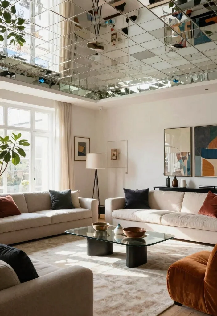 Mirrors can dramatically enhance the perception of space and light, making them a unique option for ceiling decor. By installing mirrored tiles or panels, you can create an illusion of height and brightness in any room. Eco-friendly mirror options are available, allowing you to integrate this trend sustainably.