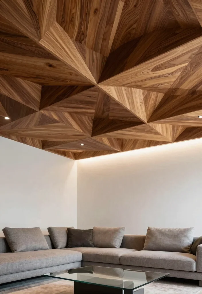 To enhance the geometric effect, consider alternating colors or finishes of the wood. This approach adds a contemporary flair while maintaining a warm, earthy feel. Installing LED strip lights along the edges can further elevate the drama of your design.
