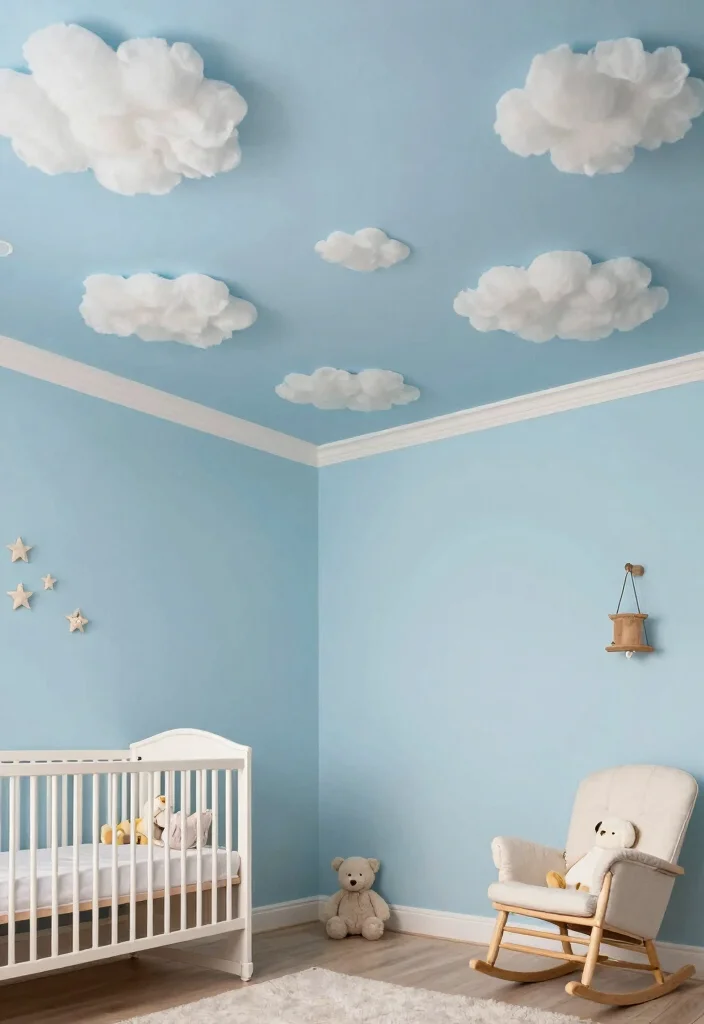 You can create fluffy clouds across the ceiling using soft whites and light blues, or even incorporate pastel colors for a more vibrant effect. This playful technique makes your room feel open and joyful every time you look up!