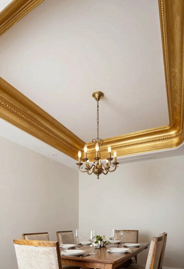 This design works wonderfully in formal dining rooms or living spaces where a touch of elegance is desired. The contrast between the ceiling and molding enhances depth and grandeur.