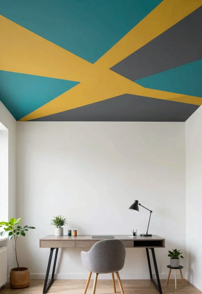 Geometric patterns can infuse a playful and modern flair into any room, especially when applied to ceilings. Think of bold designs like triangles, stripes, or chevrons, painted in eco-friendly colors that energize your space. This approach is perfect for playrooms, home offices, or any area that thrives on creativity.