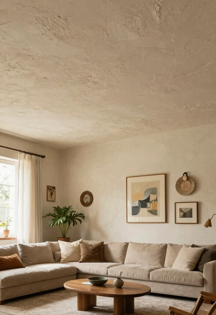 This playful ceiling technique brings a unique charm, while the textures and colors enhance the overall aesthetic of your space.