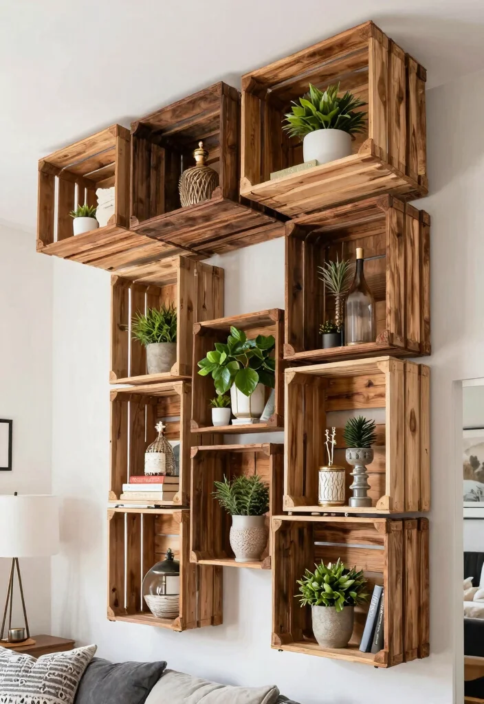 – Use crates to display decorative items or books creatively.