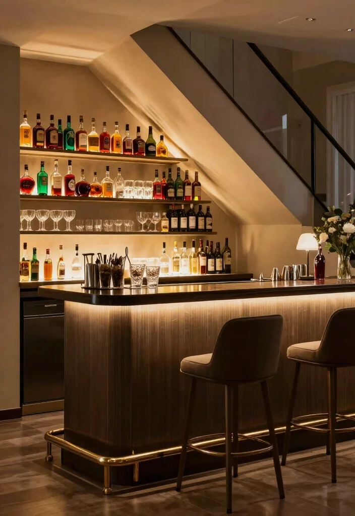 Why not create a stylish home bar under the stairs? By adding shelves for glasses, liquor bottles, and mixers, this space can become the perfect entertaining area. A small counter can serve as a bar top for preparing drinks, while bright lighting enhances the atmosphere.