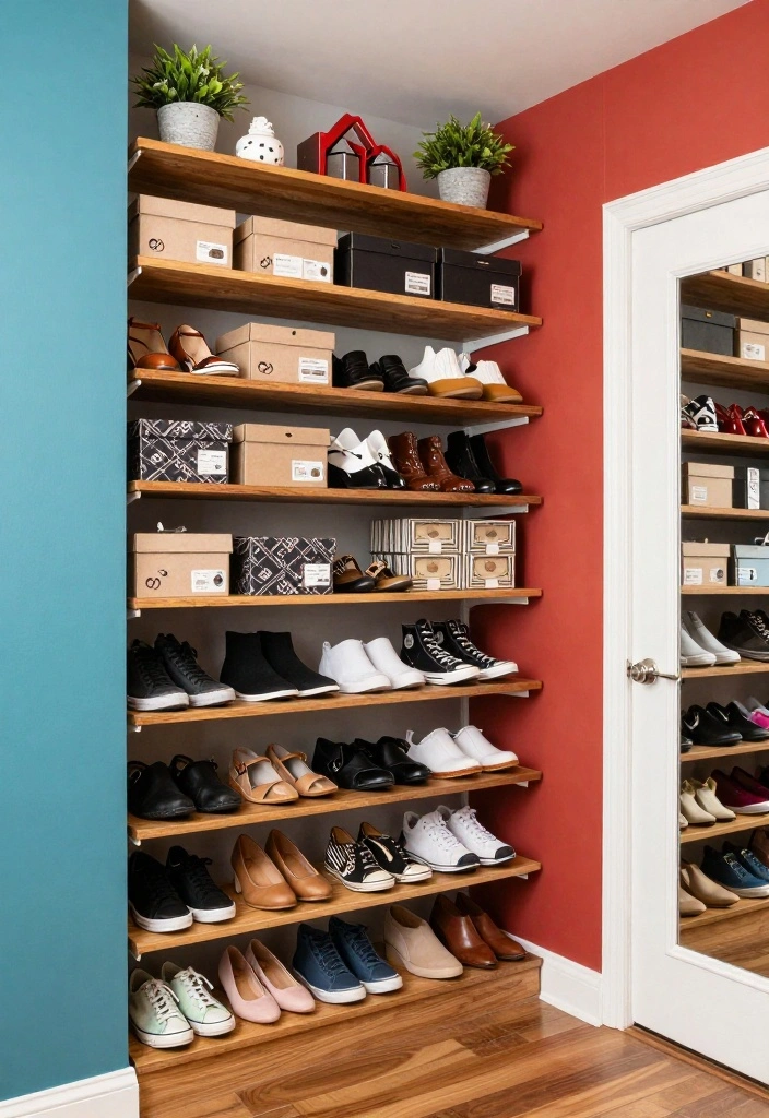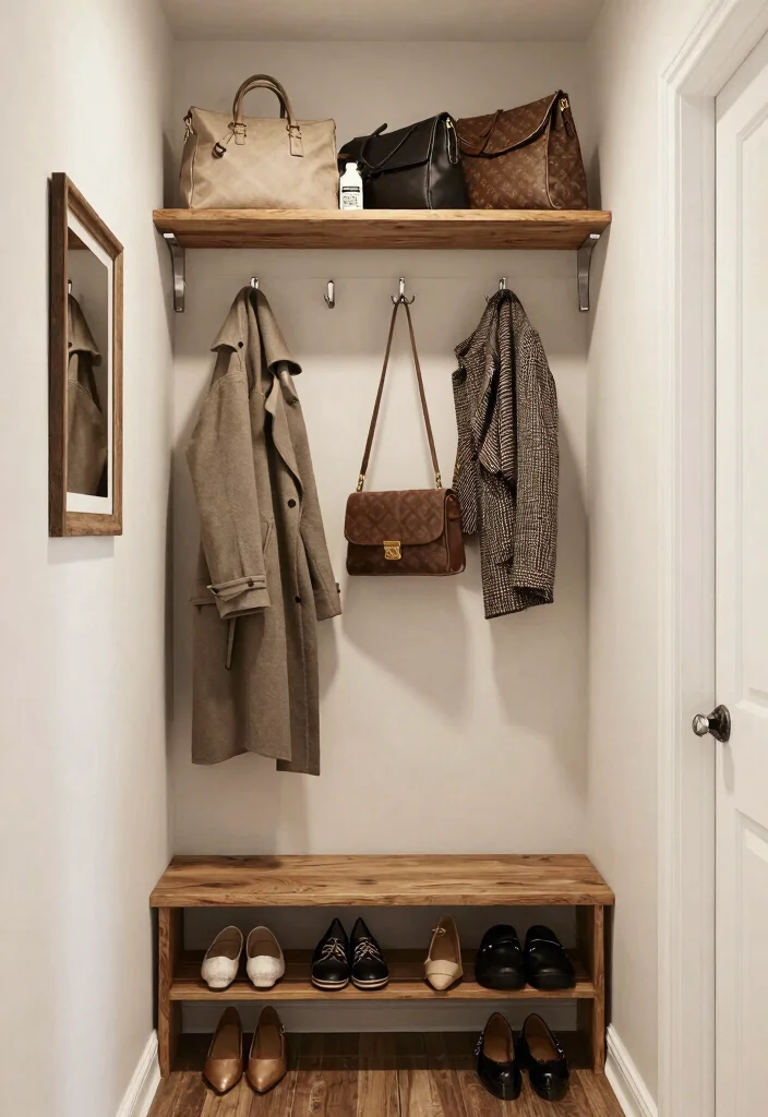Think vertical and modular. Try pull‑out shoe racks, tall slim shelves, built‑in cubbies, a compact bench with hidden storage, and hinged or sliding doors that save floor space.