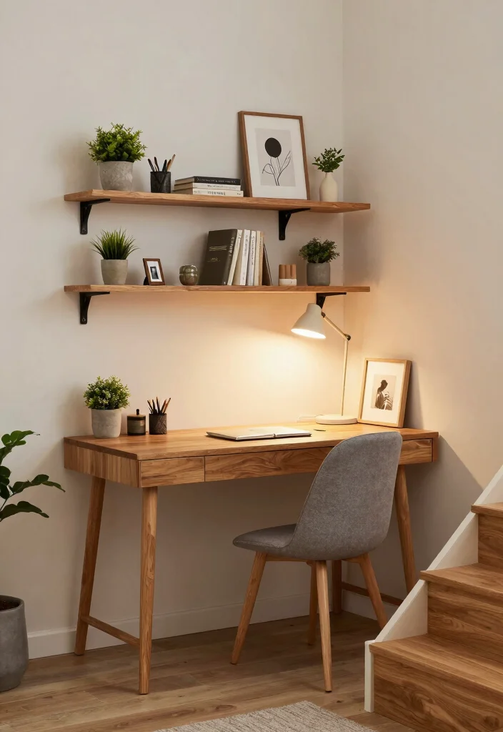Creating a mini home office under the stairs can offer you the perfect workspace. This compact area can be designed to maximize productivity without taking up too much room in your home. Picture a simple desk fitted with a stylish chair, complemented by wall-mounted shelves to keep your supplies organized. Adding personal touches like plants or inspiring quotes can transform it into a motivating space.