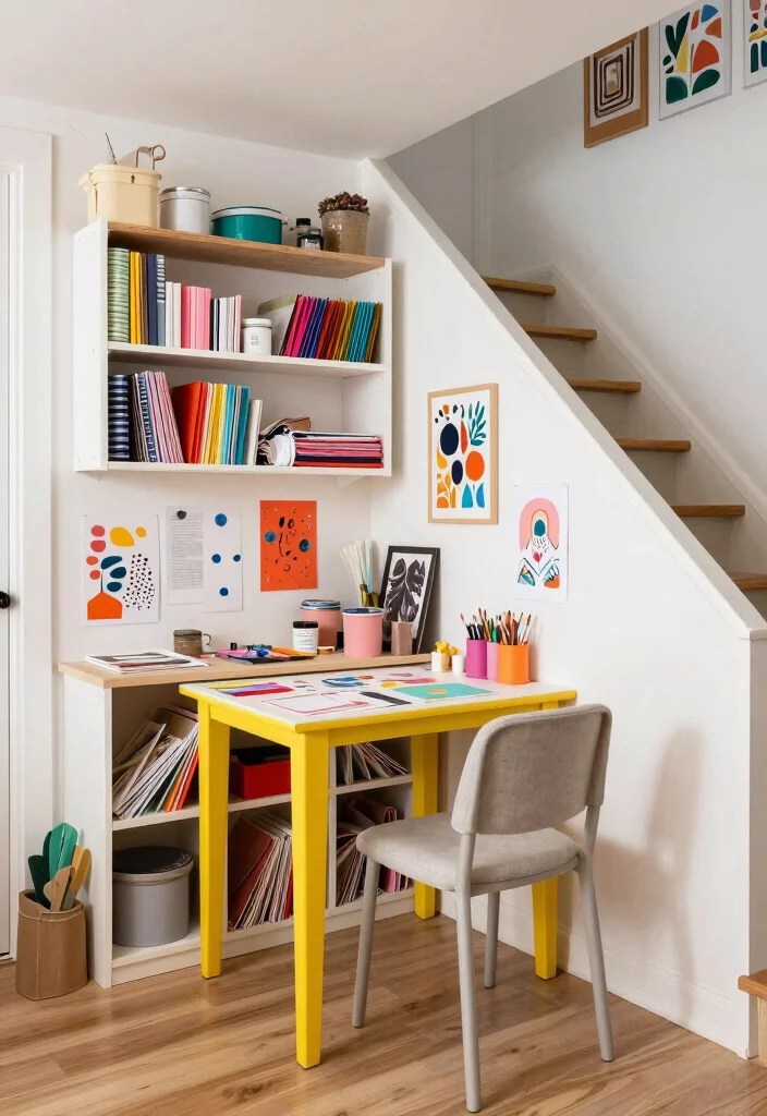 For those who love to create, turning the under-stairs area into a crafting corner can inspire endless creativity. This dedicated space can house all your supplies, from paper to fabric, while a small table provides a perfect workspace for your projects. Vibrant colors can uplift the atmosphere, making it a joy to step into each time.