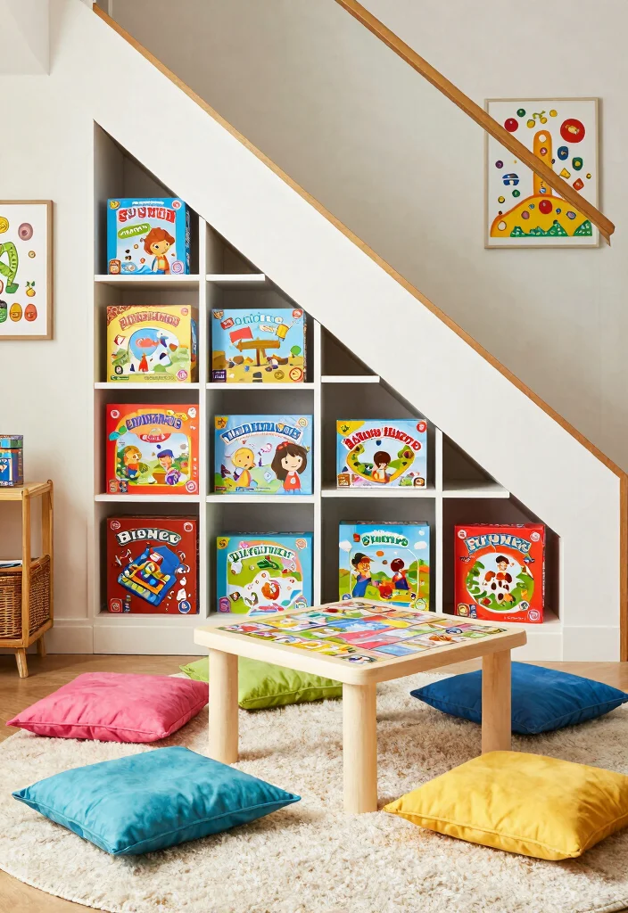 Designating the under-stairs closet for family games can keep your living area clutter-free while ensuring fun options are always on hand. Imagine shelving filled with board games and puzzles, with a small table set up for spontaneous game nights. Adding colorful boxes or baskets not only organizes but also brightens the space.