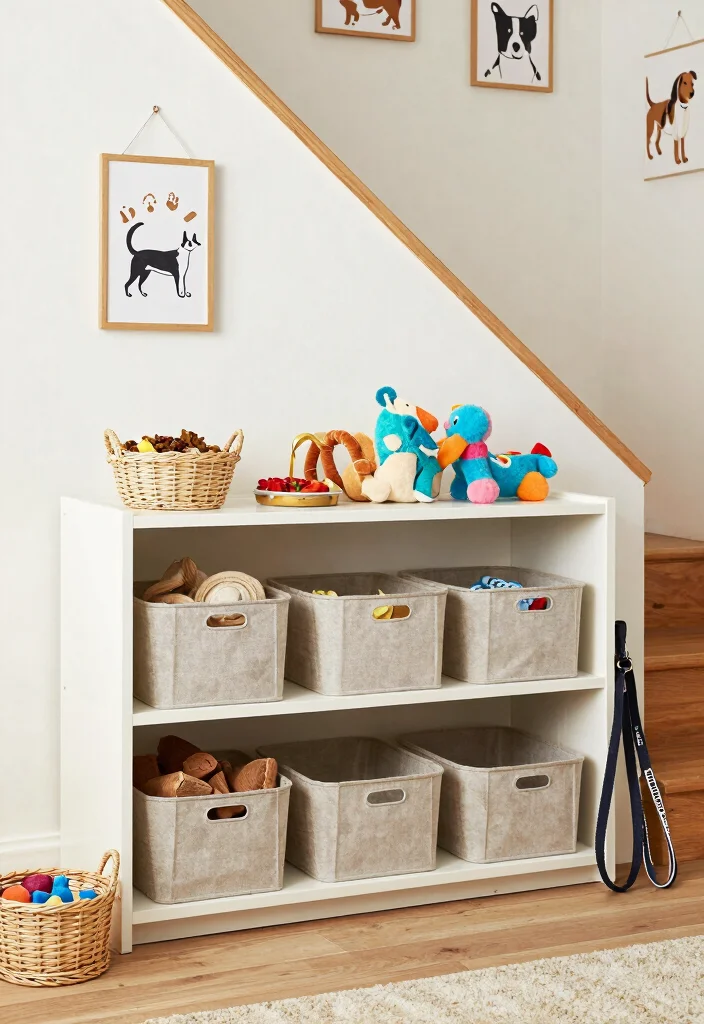 If you have furry friends, consider creating a pet supplies station under the stairs! This area can neatly house food bins, leashes, and toys while remaining easily accessible. A small basket for treats and a personalized sign can add a charming touch to the space.
