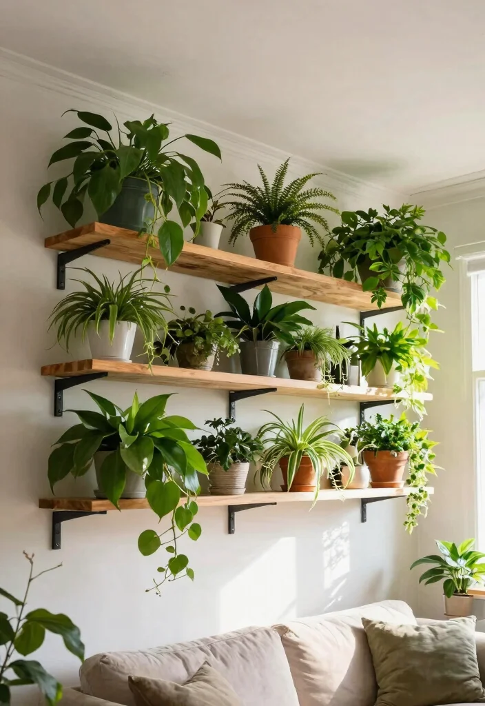 – Materials Needed: Shelving units, brackets, and plants.