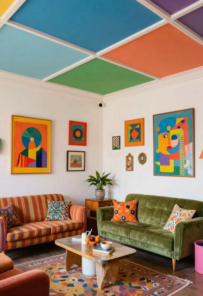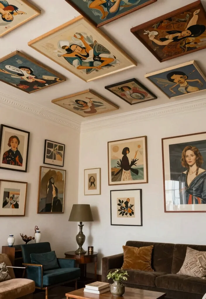 Select lightweight art pieces or framed prints that resonate with your decor theme. Secure them using adhesive or brackets, ensuring they are spaced evenly for visual balance. This innovative approach gives your ceiling a gallery-like feel, celebrating your personal style and interests.