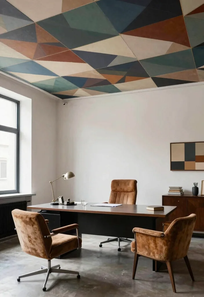 Introduce a modern flair to your vintage home with geometric patterns in your drop ceiling. Bold shapes and lines create a visually striking look that marries vintage charm with contemporary style, giving your space a fresh yet classic feel.