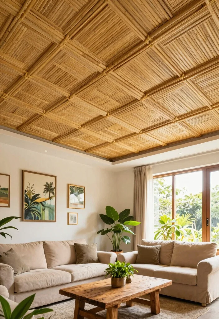 Bamboo is an eco-friendly material that offers a unique aesthetic to any room. Its natural look and feel create a peaceful environment, making it perfect for home interior decor. Bamboo’s lightweight nature and durability allow for intricate designs and patterns, from simple panels to elaborate geometric shapes. Not only does bamboo look fantastic, but it’s also a rapidly renewable resource, making it a top choice for sustainability. When selecting bamboo for your false ceiling, consider using a mix of horizontal and vertical strips to add depth. Pairing bamboo with warm-toned lighting can enhance its natural beauty, creating a cozy space that feels inviting. Key Tips: – Ensure proper treatment for moisture resistance. – Use sustainable bamboo sourced from reputable suppliers. – Mix finishes for a modern touch. Bamboo can also be used alongside other sustainable materials like reclaimed wood for added texture. Issues to Consider: Be cautious of low-quality bamboo that can warp over time due to humidity. Lighting Suggestions: Opt for recessed lighting to highlight the bamboo patterns or pendant lights that complement its earthy tones.