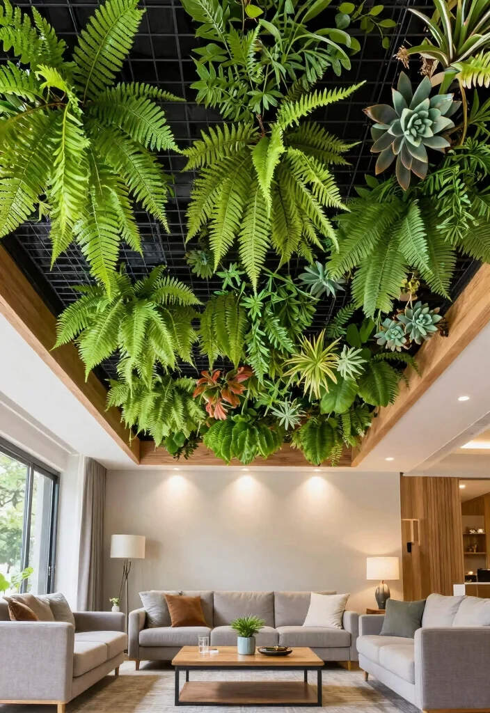Vertical gardens are no longer limited to walls; they can also be incorporated into ceiling designs. Creating a green ceiling not only purifies the air but adds a stunning visual element to any space. Using sustainably grown plants, such as ferns or succulents, can contribute to both aesthetic and health benefits. This innovative approach can make a striking statement, especially in living rooms or dining areas. Installing a grid system allows for easy maintenance and arrangement of plants, ensuring your ceiling remains fresh and vibrant year-round. Key Tips: – Choose low-light, low-maintenance plants to ensure longevity. – Ensure proper watering systems are in place to avoid mess and damage. – Combine greenery with natural materials like wood for an organic look. Green ceilings not only look great but can also help improve indoor air quality, providing a healthier living environment. Issues to Consider: Careful planning is required to ensure adequate support and watering systems for the plants. Lighting Suggestions: Incorporate soft, diffused lighting to enhance the lush appearance of the vertical garden while maintaining an inviting ambiance.