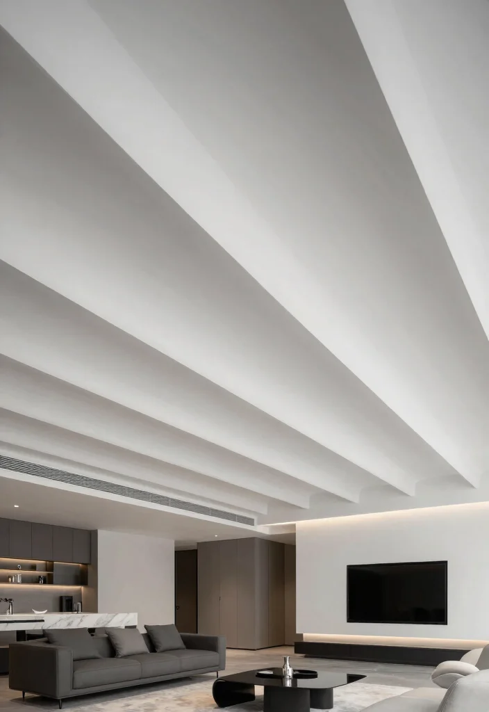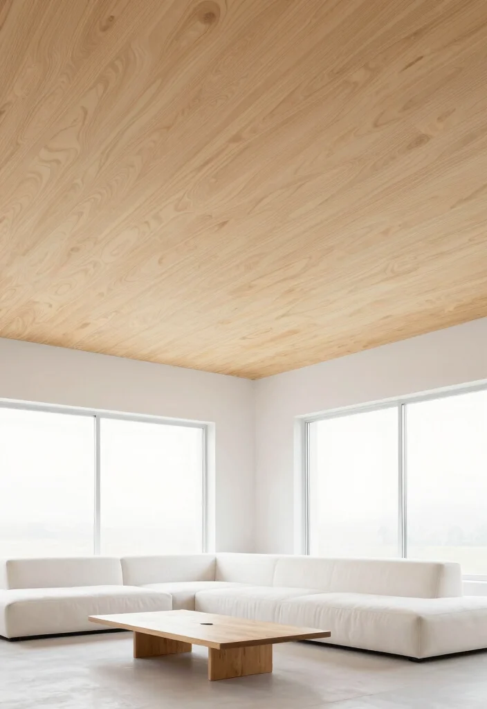Plywood is an underrated but fantastic option for modern ceilings. This sustainable material provides a clean, minimalist look that works seamlessly in contemporary home decor. The beauty of plywood lies in its versatility—it’s easy to work with and can be cut into unique shapes and designs. For a modern twist, consider layering plywood panels at different angles or heights. This creates a dynamic profile that adds depth without overwhelming the space. Plywood’s natural grain adds warmth, making it a great choice for cozy interiors. Key Tips: – Choose high-quality, sustainably sourced plywood for the best results. – Keep the color palette neutral to maintain a minimalist vibe. – Experiment with various thicknesses for added texture. Plywood can also be painted or stained to achieve different effects, allowing for endless customization. Issues to Consider: Ensure proper installation and sealing to protect against moisture damage. Lighting Suggestions: Use simple, modern pendant lights to maintain the minimalist theme while providing functional lighting.
