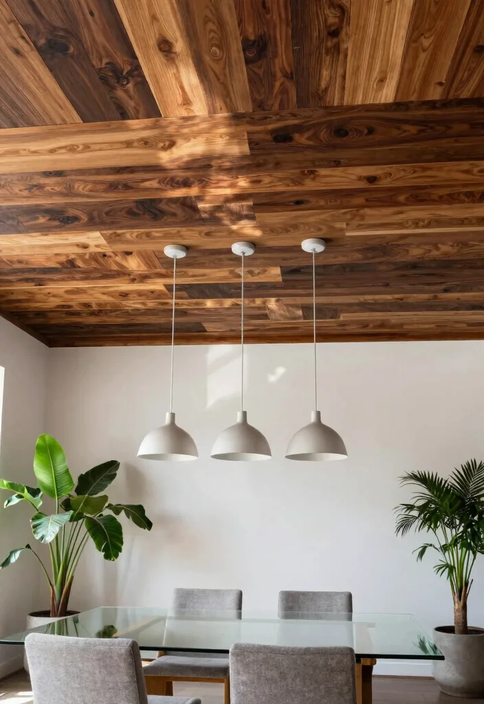 Recycled wood ceilings bring a rustic yet modern charm to any home. Using salvaged wood not only reduces waste but also adds character that new materials simply can’t replicate. With its varied textures and colors, recycled wood can create stunning visual contrasts, making spaces feel both unique and grounded. For the best effect, choose different types of wood and finishes. Mixing dark and light woods can add depth and interest. This approach works well in contemporary settings, where minimalism meets the organic look of wood. Key Tips: – Look for reclaimed wood from old barns or factories. – Consider a matte finish to enhance the natural beauty without shine. – Use larger planks for a more dramatic effect. Recycled wood can also be used to create custom light fixtures or wall art, further enhancing the eco-friendly theme. Issues to Consider: Ensure the wood is properly treated to prevent pests or mold. Lighting Suggestions: Warm-toned pendant lights can complement the wood’s rustic appeal, creating a cozy atmosphere.