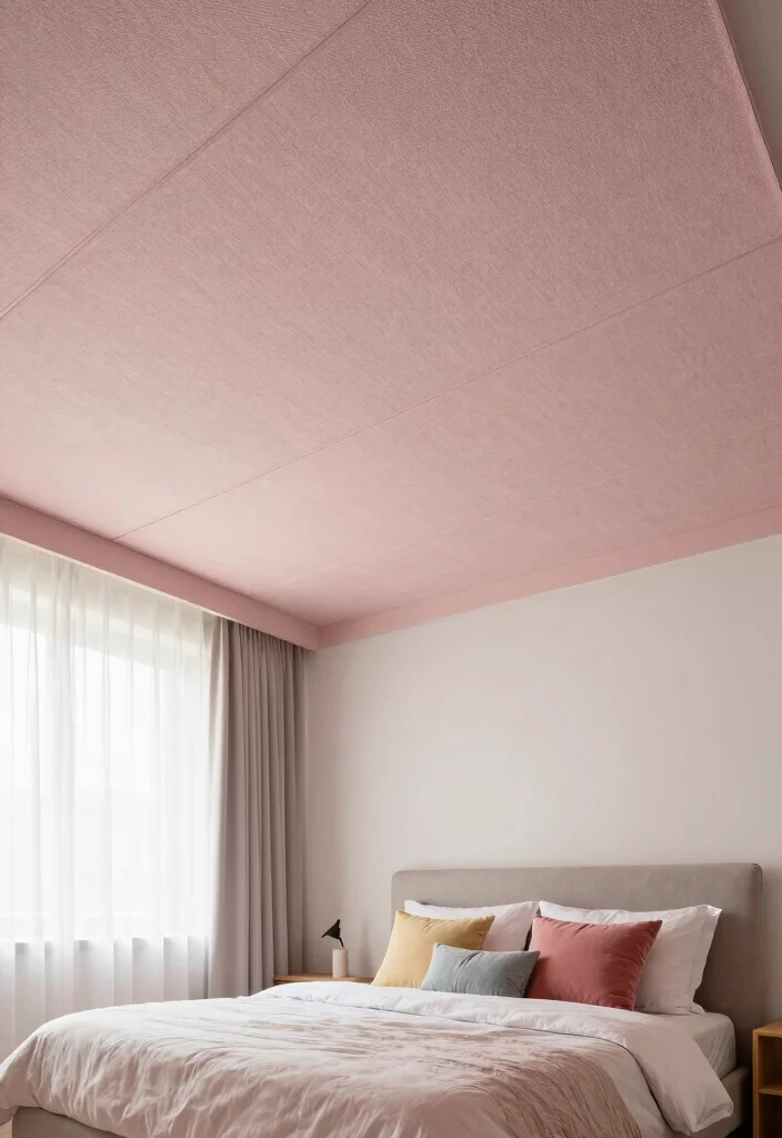 Fabric-covered ceilings offer a unique way to introduce softness and warmth into a space. Textile panels can be used to create a cozy atmosphere while also providing sound absorption, making them perfect for living rooms and bedrooms. You can choose from a variety of colors and textures to match your decor and style. Opt for organic fabrics such as cotton or linen to keep your design sustainable. The variety in textures allows you to create layers, giving your ceiling a more dynamic feel. Additionally, fabric can be easily replaced or updated, allowing for flexibility in your home’s look. Key Tips: – Ensure the fabric is treated for fire resistance. – Use a light color palette for smaller spaces to make them feel larger. – Consider incorporating acoustic panels for added soundproofing. Mixing fabric types can create a unique look—think linen mixed with velvet for added depth. Issues to Consider: Fabric can attract dust; regular cleaning is essential to maintain its appeal. Lighting Suggestions: Soft, diffused lighting can enhance the cozy vibe created by the fabric-covered ceiling.
