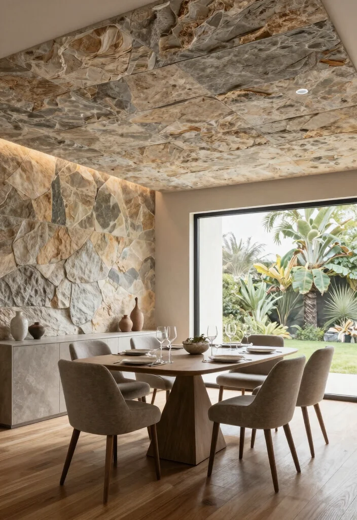 For an upscale and luxurious feel, natural stone ceilings offer a timeless elegance that’s hard to beat. Using sustainably sourced stone like slate or limestone can dramatically enhance the beauty of your home while promoting eco-friendly choices. Stone ceilings create a unique look and are incredibly durable, making them ideal for high-traffic areas. Each stone has its own character, so working with a variety of stones can create a visually stunning ceiling design. Consider incorporating accent lighting to highlight the stone’s texture and colors, creating a captivating focal point. Key Tips: – Choose lighter stones for smaller spaces to avoid a heavy feel. – Mixing different stone types can add to the visual richness. – Utilize stone in combination with wooden beams for a rustic yet elegant vibe. Stone ceilings are less common, making them a unique selling point for your home if you ever choose to sell. Issues to Consider: Stone can be heavy; ensure proper structural support before installation. Lighting Suggestions: Recessed lighting can help to showcase the stone’s natural beauty without overwhelming the space.