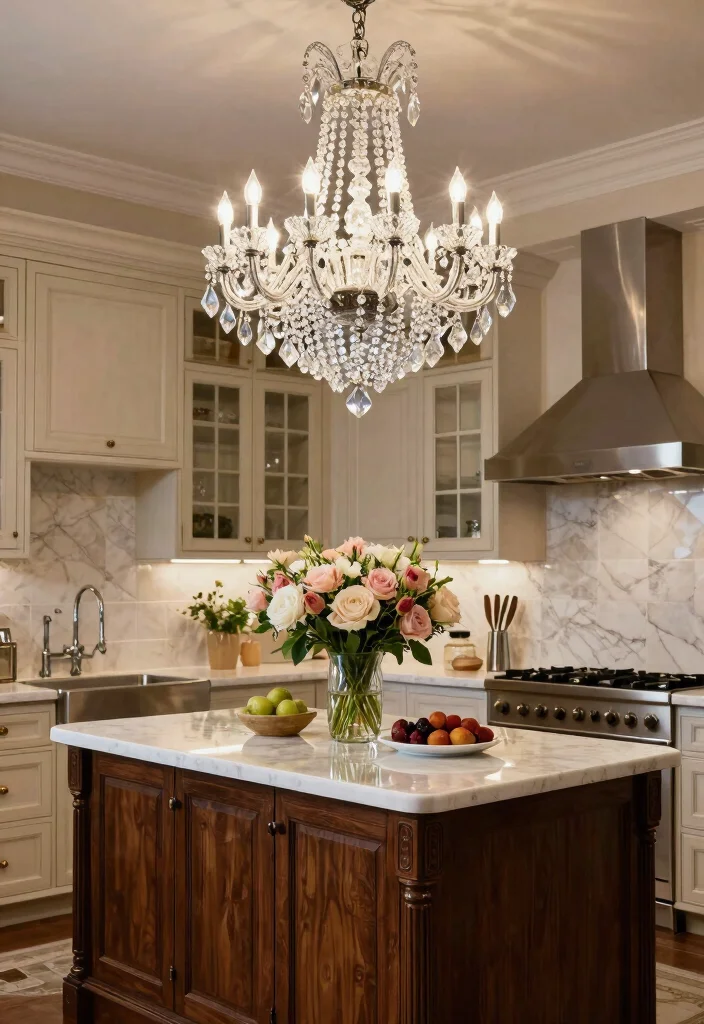 Incorporating a crystal chandelier elevates your culinary space, turning it into a stunning focal point.