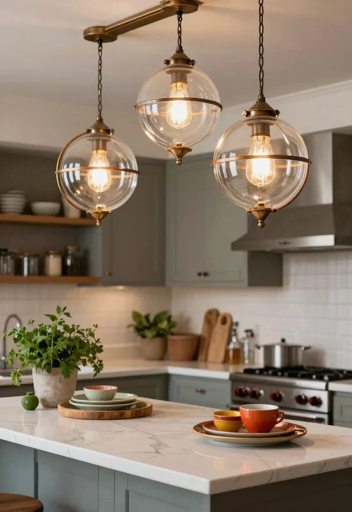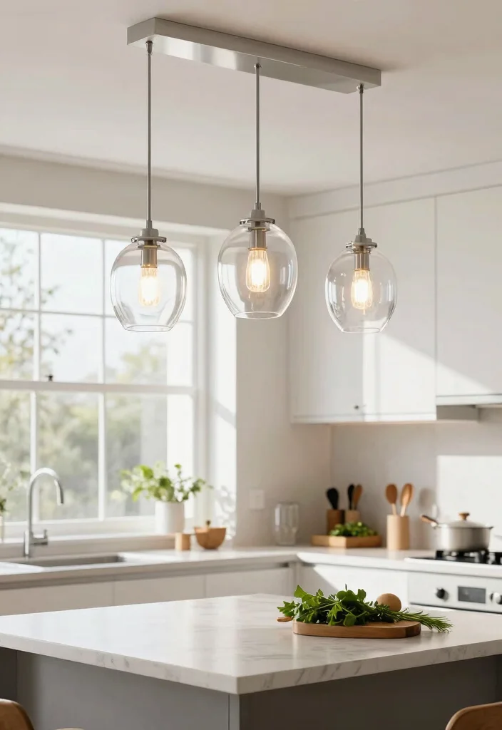 For a striking impact, consider using multiple glass fixtures above your island, each fitted with energy-efficient LED bulbs to enhance their brilliance. This combination not only looks stunning but also supports current trends in energy conservation and modern living.