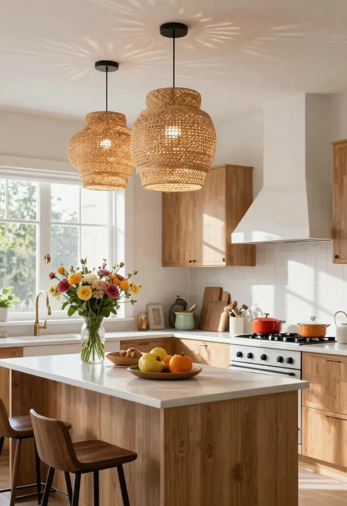 By adding woven light fixtures, you infuse your kitchen with natural beauty and warmth, creating a cozy atmosphere.
