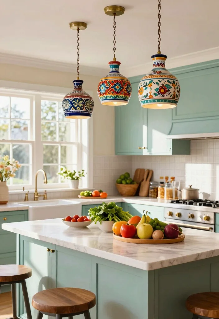 Pair these colorful fixtures with soft LED bulbs to enhance their vivid tones while creating a warm and inviting atmosphere. Their unique artistry reflects a sense of culture and creativity, making them perfect for any kitchen.