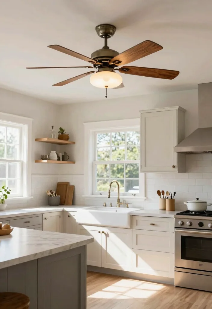 Choosing a ceiling fan that complements your decor is essential, as it can help maintain comfort while ensuring adequate light over the sink. This practical choice balances style with functionality for a well-designed space.