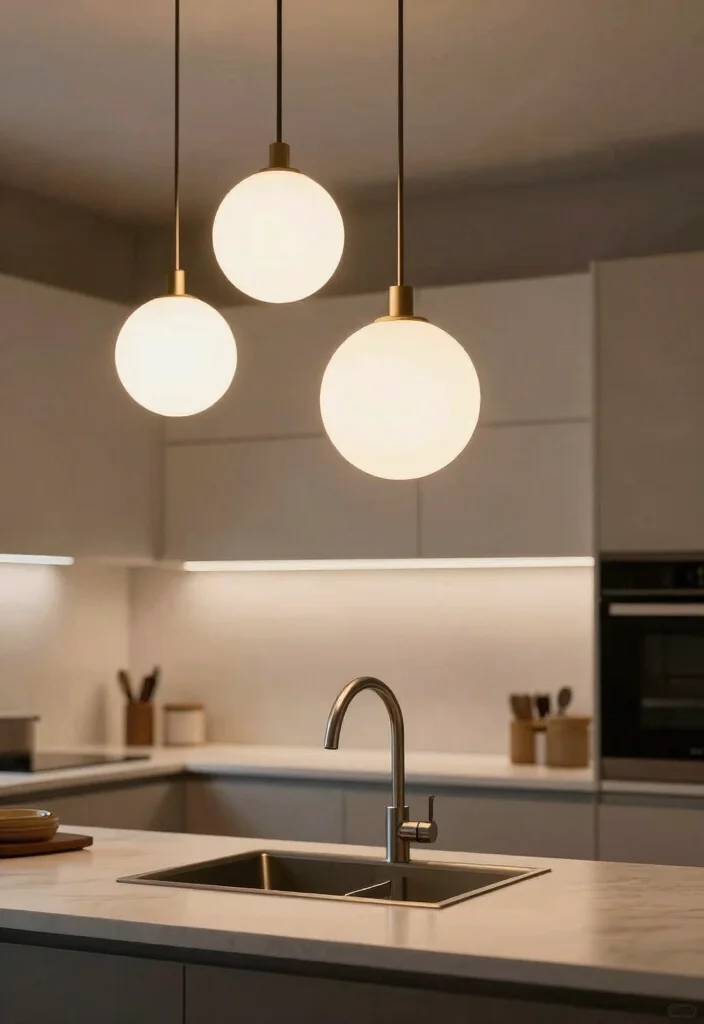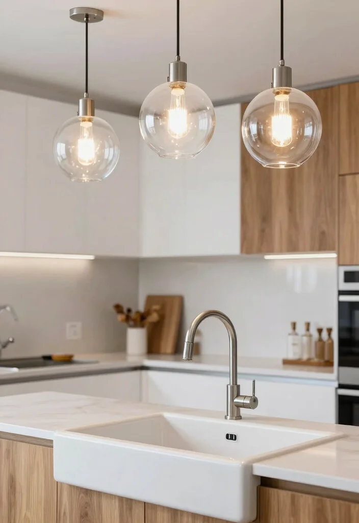 Fun fact: Globe lights can boost sink-area brightness by up to 30% with soft, even diffusion. Hang varying globe sizes to create drama and a polished focal point above your sink, using clear or frosted glass for a warm, modern farmhouse glow in kitchen lighting fixtures over sink.