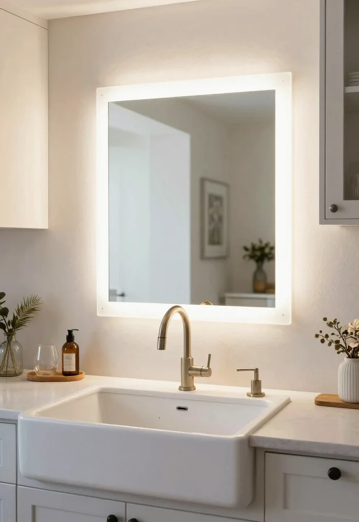 A lighted mirror above the sink adds both functionality and a touch of glamour to your kitchen. This fixture not only beautifully frames the sink area but also provides essential illumination for tasks like dishwashing and food prep. Choose a design that complements your kitchen’s overall decor, whether modern or vintage, to enhance the space further.