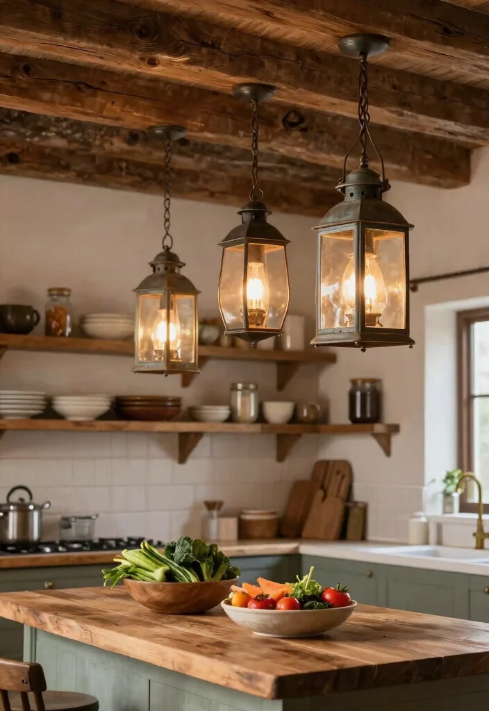 The warm embrace of rustic wooden beams paired with lantern-style pendants creates a cozy and inviting kitchen atmosphere. This combination works beautifully because the natural wood tones enhance the vintage charm of metal lanterns, creating a space that feels both welcoming and rich in character. Imagine a kitchen where beams of reclaimed wood meet matte black lanterns, perfectly embodying that timeless farmhouse aesthetic.