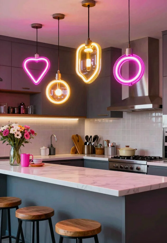 For a bold and energetic statement, bright neon pendant lights can revitalize your kitchen. These eye-catching fixtures bring a sense of fun and whimsy, perfect for those looking to inject personality into their space. Available in classic neon colors or unique shapes, they can serve as playful focal points in contemporary designs.