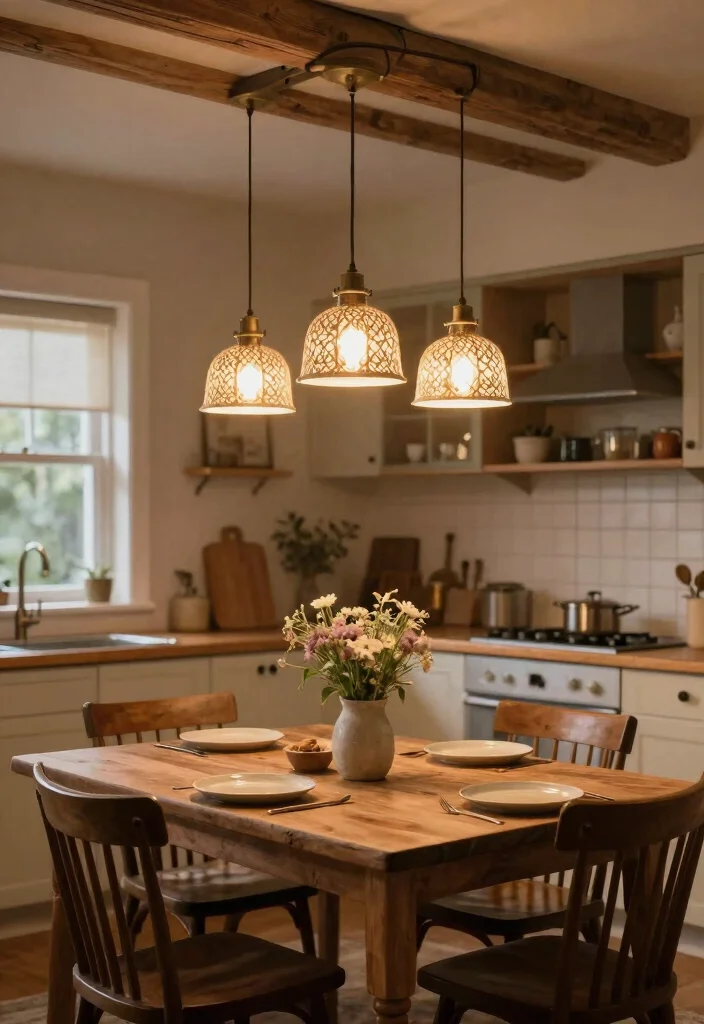 Vintage pendant lights prove that kitchen table lighting shapes ambiance more than color palettes. A warm-toned bulb at 2700K above the table turns meals into memories—try 20–26 inches and pair with a rustic reclaimed wood surface for instant coziness.