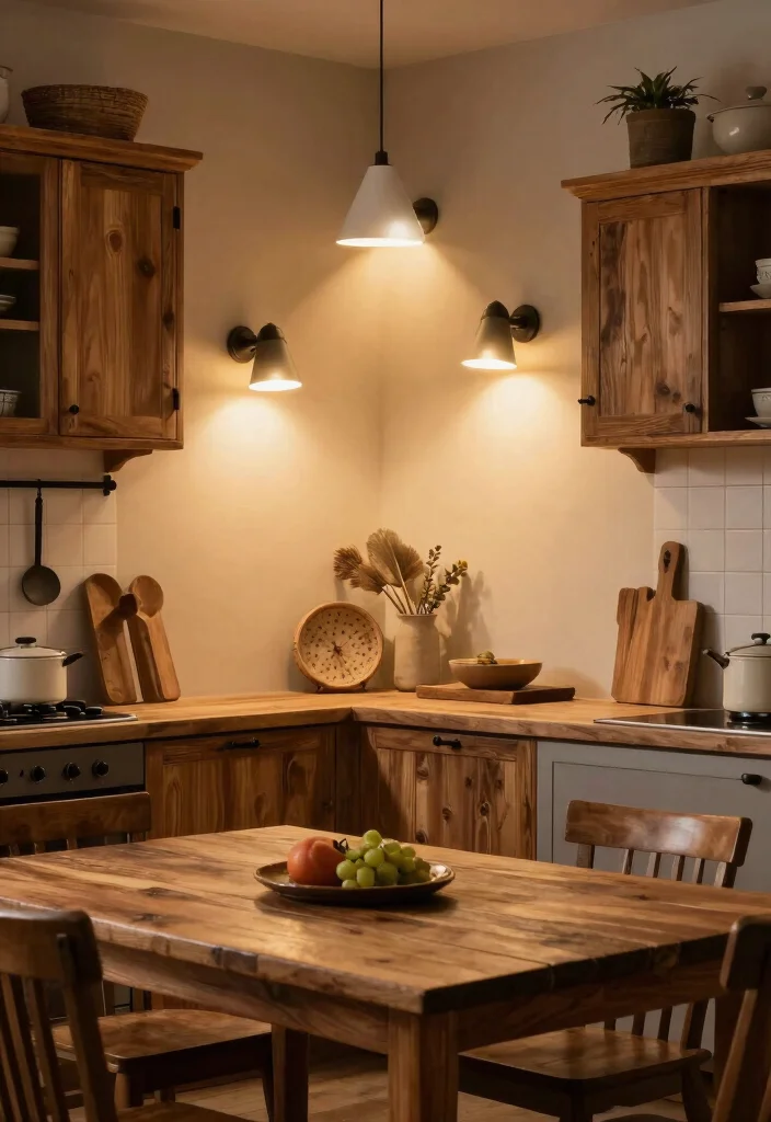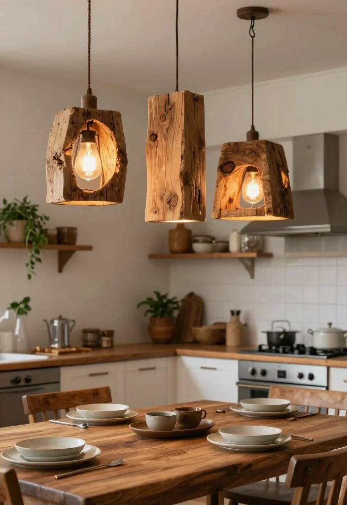 Reclaimed wood lighting fixtures bring authentic rustic charm to your kitchen. Each piece carries a unique story, adding character and a sense of history to your dining space.