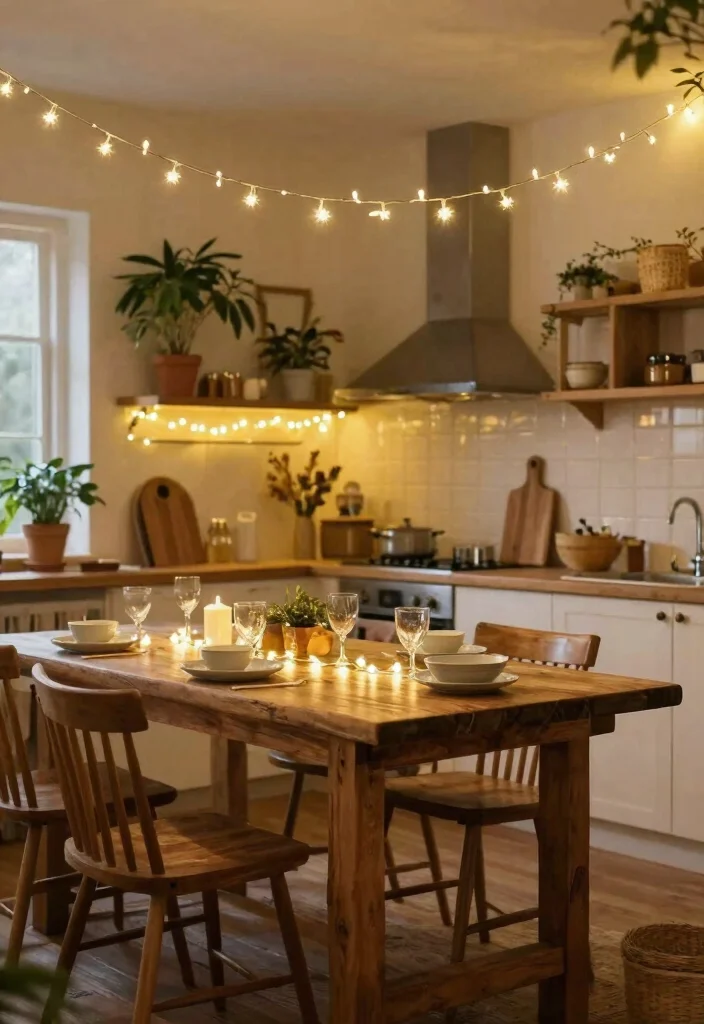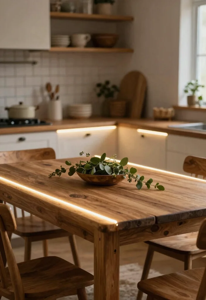 For a fresh take on rustic decor, soft LED strip lights can be creatively integrated around your kitchen table area. These lights provide a gentle glow that enhances warmth without overpowering the space.