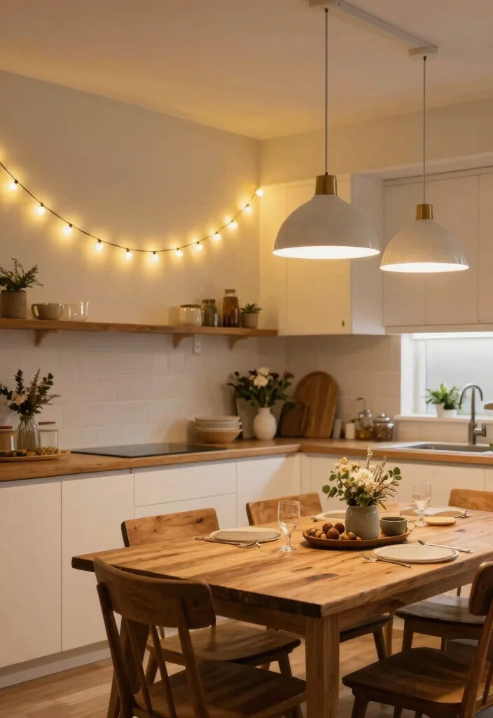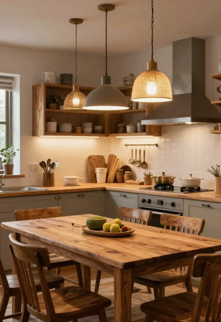 Think warm, inviting, and functional. Start with a central pendant or rustic lantern above the table to define the dining zone as kitchen table lighting. Add two table lamps for dining at the ends if space allows, to soften shadows and create cozy focal points. Choose bulbs at 2700–3000K and install a dimmer to glide between bright family meals and intimate dinners, blending with your kitchen lighting design and ambient lighting ideas.