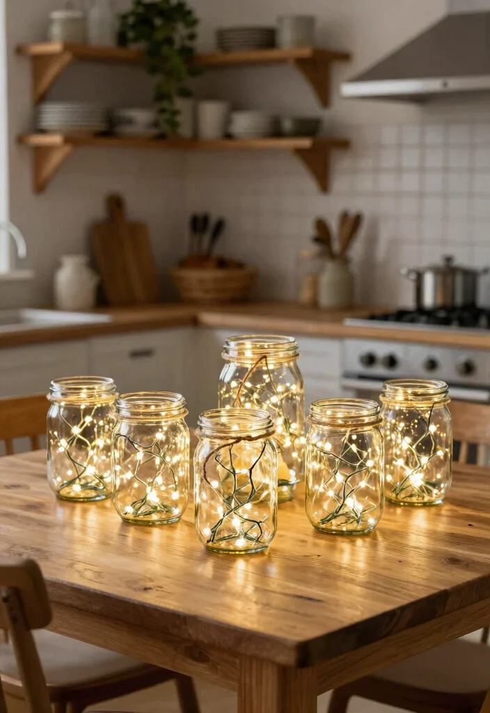 Mason jar lanterns bring a whimsical flair to your kitchen table, adding rustic charm and a personal touch. These jars can be filled with fairy lights, candles, or seasonal flowers, making them perfect for any occasion.