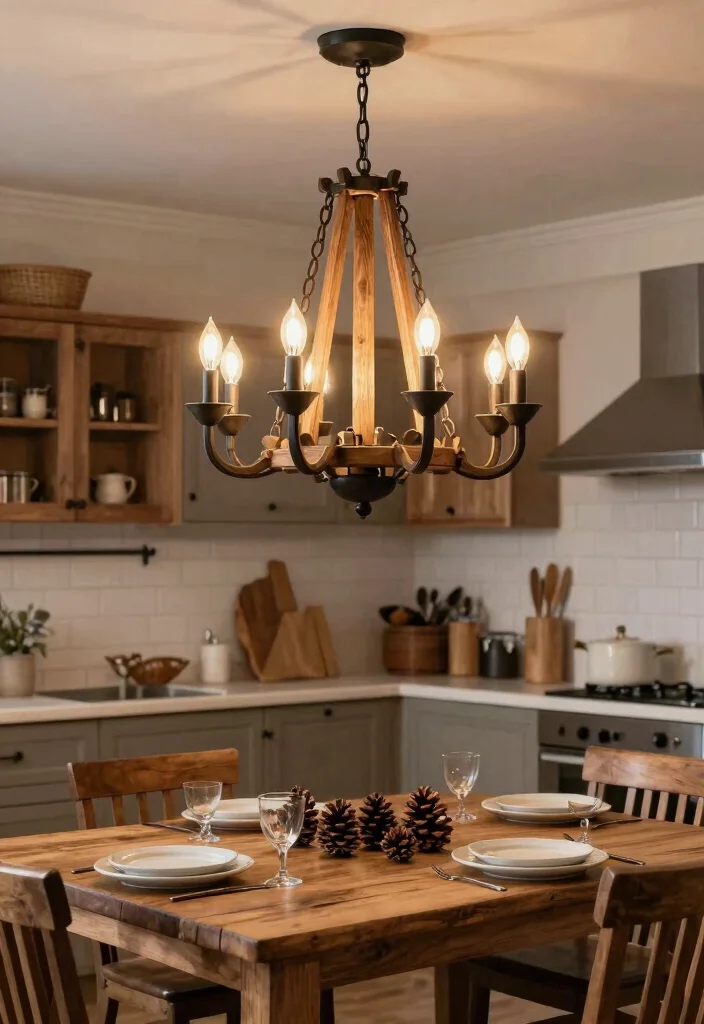 A chandelier instantly elevates your dining experience, especially when positioned over your kitchen table. Opt for designs that combine wood and wrought iron for a genuine rustic aesthetic that makes a statement.
