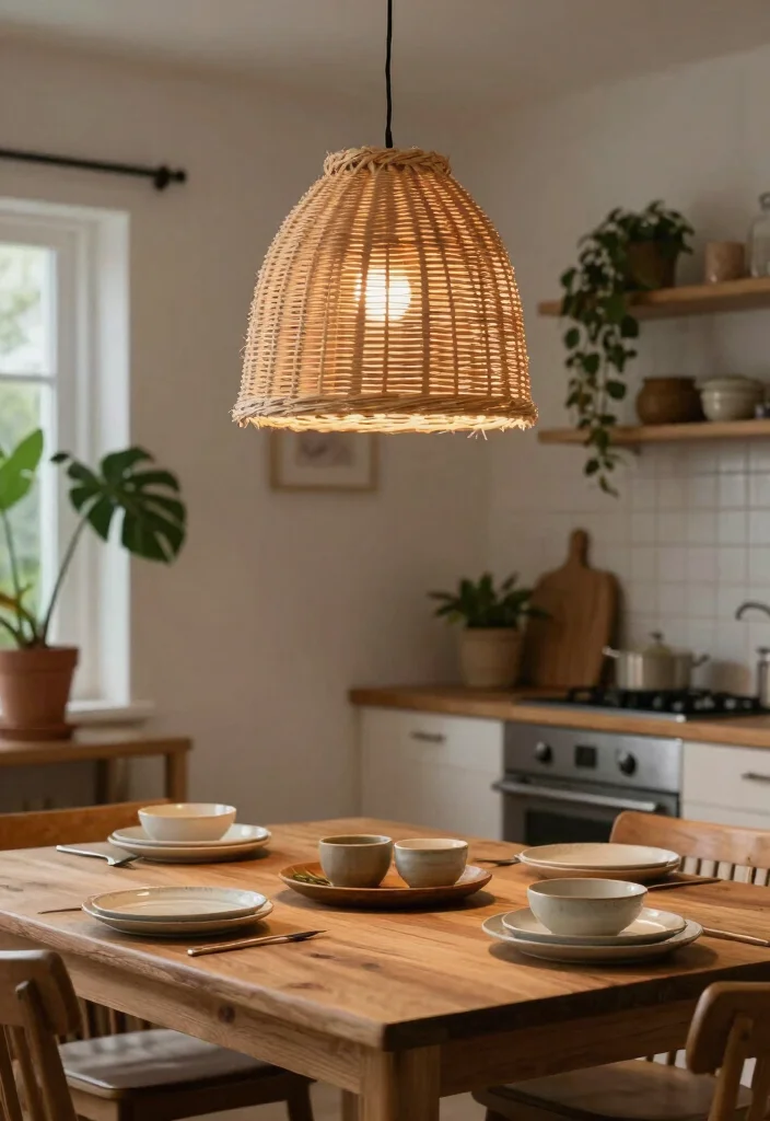 Natural fiber lighting introduces organic textures into your kitchen, creating a warm and inviting atmosphere. Fixtures made from rattan, jute, or wicker add character while diffusing soft light throughout the space.