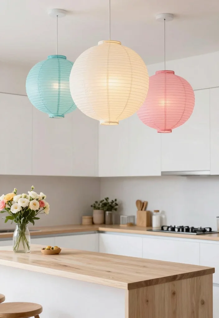 Paper lanterns offer a lightweight and whimsical option for lighting above your kitchen island. Available in various colors and styles, these fixtures can add a playful element to your decor while fitting beautifully into a modern minimalist aesthetic.