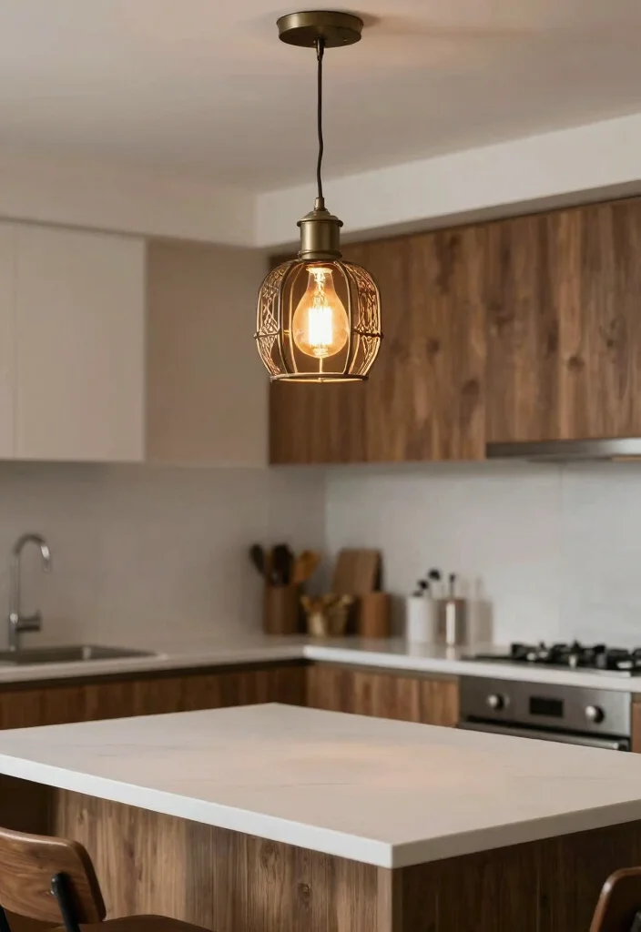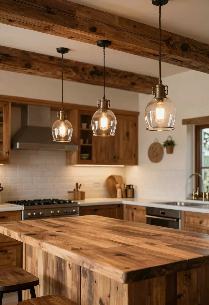 Fun fact: 78% of designers say warm, rustic lighting above kitchen island instantly makes a space feel welcoming. Pair reclaimed wood beams with pendant lights for a modern-rustic vibe, and choose bulbs around 2700K for that cozy glow.