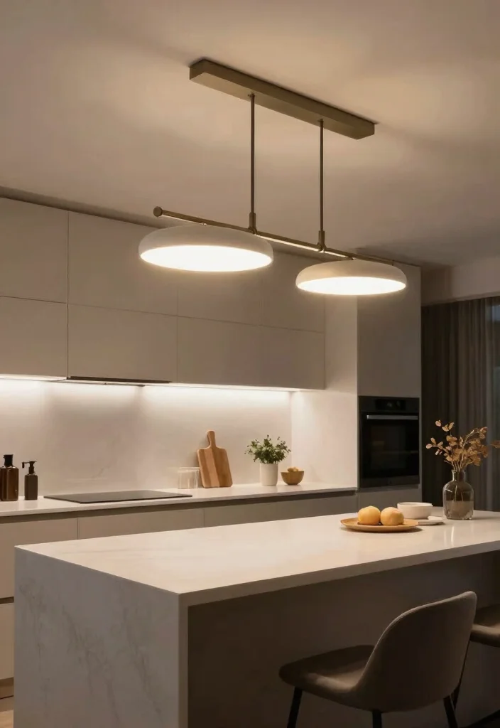 For a modern minimalist look, aim for 2–3 pendants on a 6–8 ft island (or 3–4 on a longer island). Space them about 24–30 inches apart and hang the fixtures so the bottom edge sits roughly 30–36 inches above the countertop. Choose clean, geometric pendants in matte metals or glass with simple profiles—think pendant lights for kitchen islands that read as décor and lighting. If you prefer a single line, a slim linear fixture can achieve the same effect while keeping the field uncluttered.