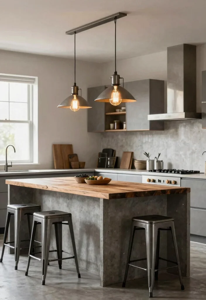 Industrial style lighting brings a unique charm to your kitchen, merging rustic and modern elements seamlessly. With exposed bulbs, metal finishes, and distressed textures, these fixtures provide an edgy contrast to sleek surfaces, making them an ideal choice for modern minimalist aesthetics.