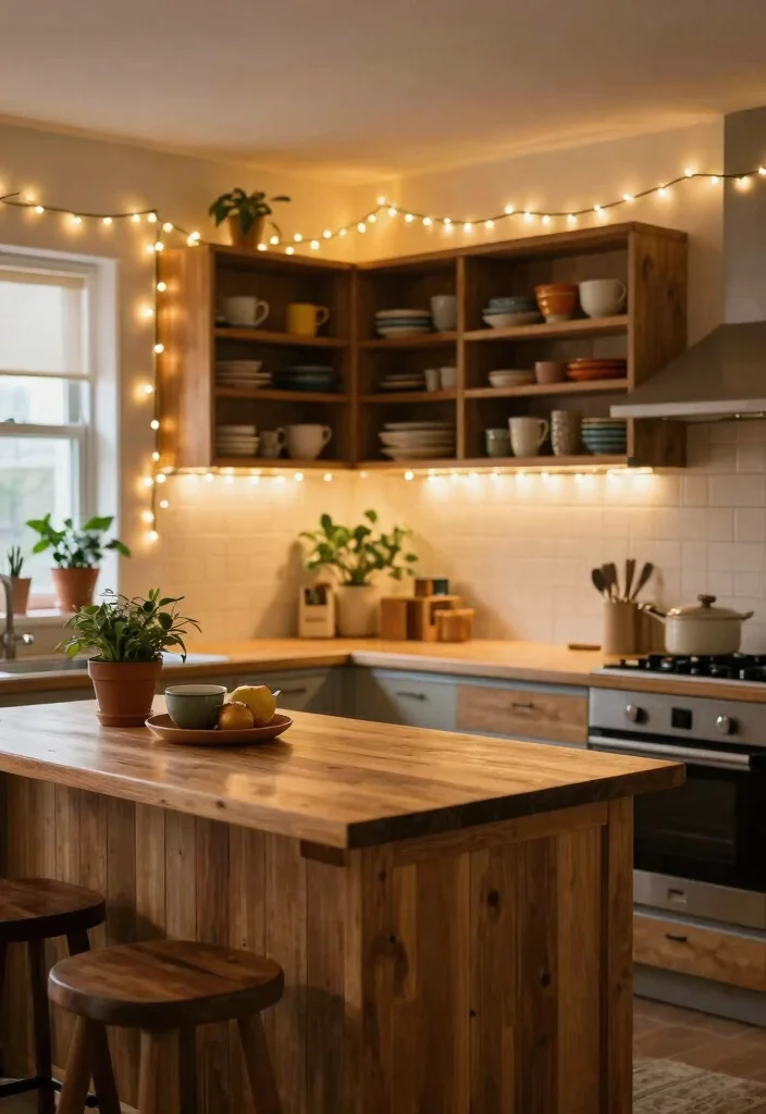 Threading them along the edges of your island or draping them overhead adds a playful element to your decor. Opt for warm white bulbs for a soft glow that complements your kitchen’s charm without overwhelming the design.