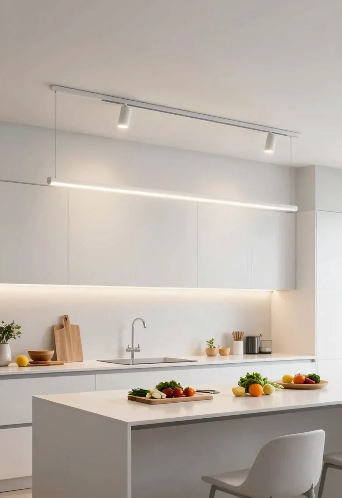 Opt for slim, unobtrusive tracks that seamlessly integrate into your kitchen design. Choose fixtures with clean lines to maintain a streamlined look that highlights your island.