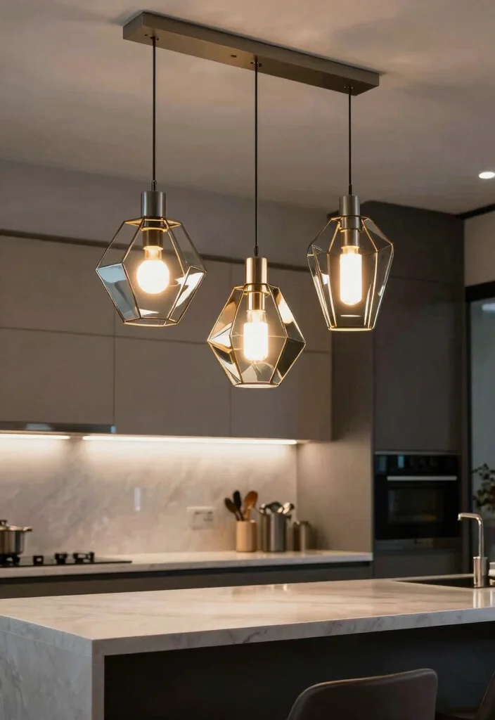 What are the latest home lighting trends for modern interior decor that work well around kitchen islands?