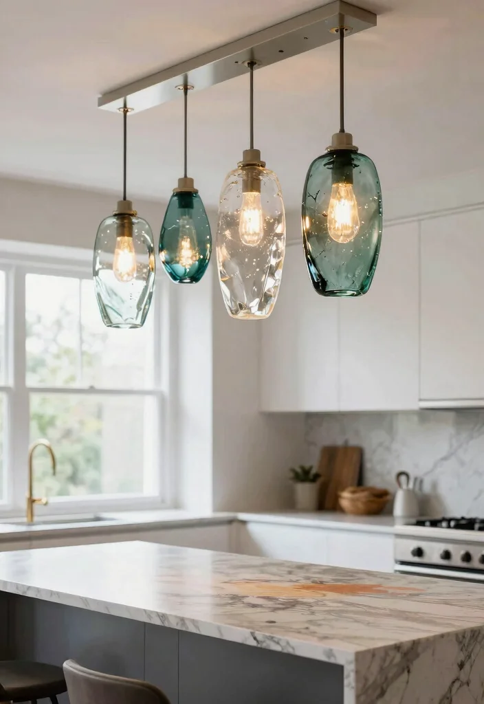 Recycled glass lighting fixtures bring a unique beauty to your kitchen island while supporting eco-friendly practices. These pieces come in various shapes and colors, making them perfect for adding character and charm to your space. Select fixtures that showcase the natural imperfections of recycled glass, which add an authentic touch to your decor.