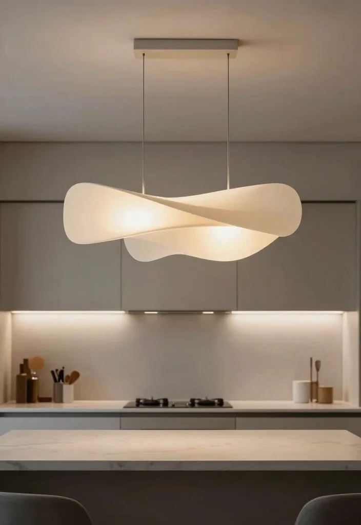 Choosing a dramatic sculptural light can elevate your kitchen into an artistic masterpiece.