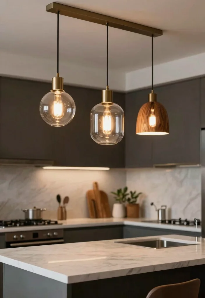 Combining various materials in your lighting fixtures can create a visually engaging experience for your kitchen island. Whether mixing metal with glass or wood with fabric, this contrast adds depth and character to your design. This approach thrives in modern kitchens, where creativity is key to personalization.