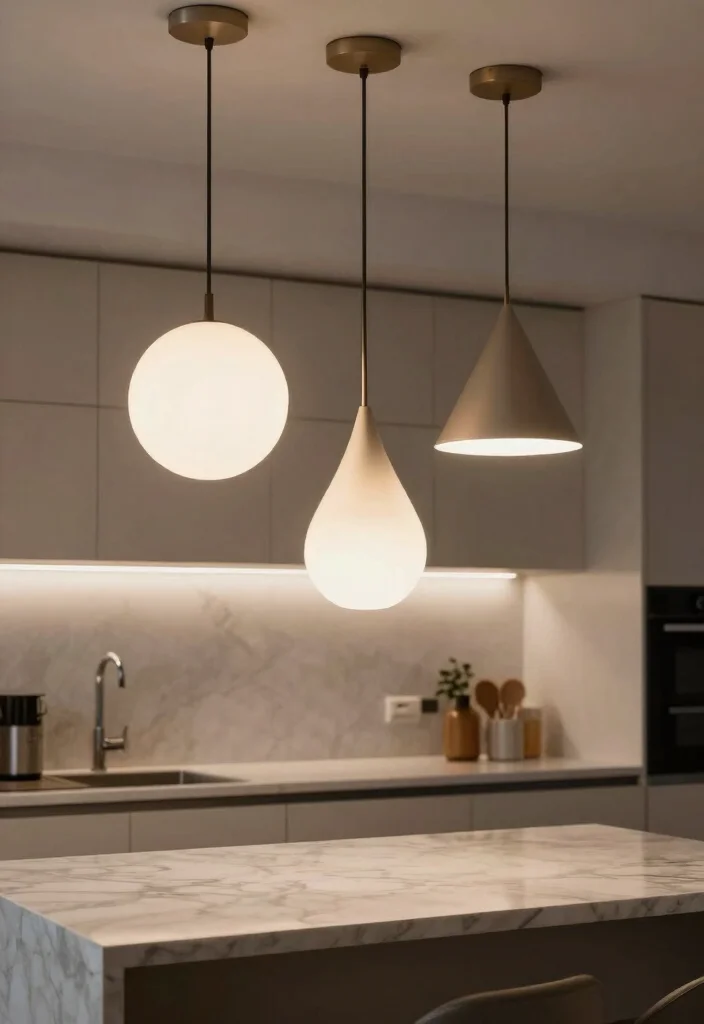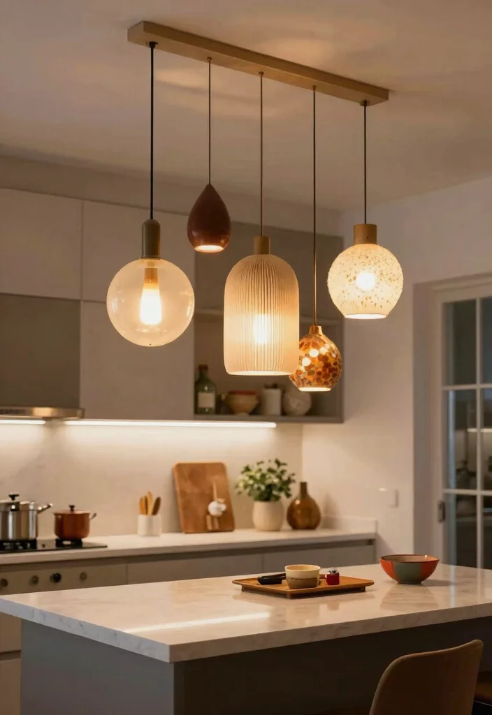 Choose uniquely shaped pendant lights to add an artistic flair and personality to your kitchen space.