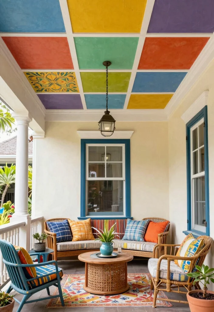 Opt for bold colors on your ceiling for a vibrant and inviting outdoor atmosphere.